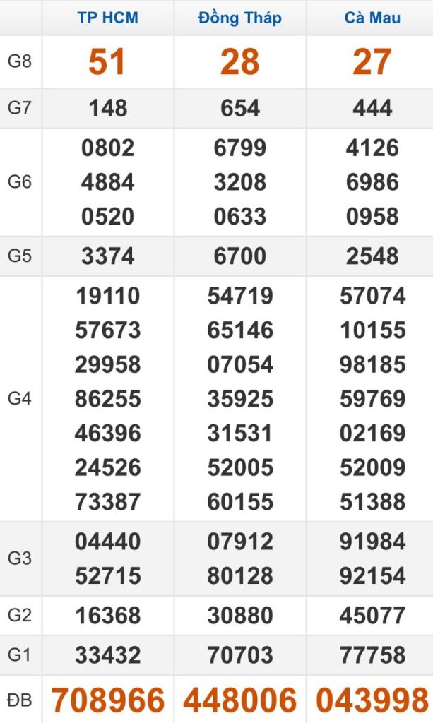 Xem lại kết quả TP Hồ Chí Minh có giải 8 con 07 nên chúng tôi khuyên bạn chốt con 98 – 40 – 52 – 12. Đề về 88 là dấu hiệu số 09 – 54 – 30 – 20 sẽ về.