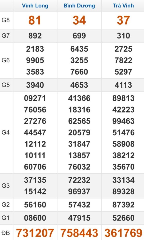 Kỳ trước Trà Vinh có giải 8 con 38 nên chốt số 33 – 02 – 26 – 34. Đề về 97 nên đánh con 60 – 31 – 68 – 69 xem sao.