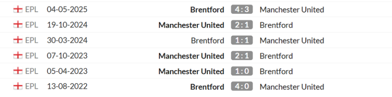 Lịch sử đối đầu giữa Brentford vs Man United đang nghiêng về phía đội bóng thành Manchester. Trong 6 lần chạm trán gần nhất, Quỷ đỏ giành được 3 chiến thắng, 1 trận hòa và 2 thất bại trước Brentford.