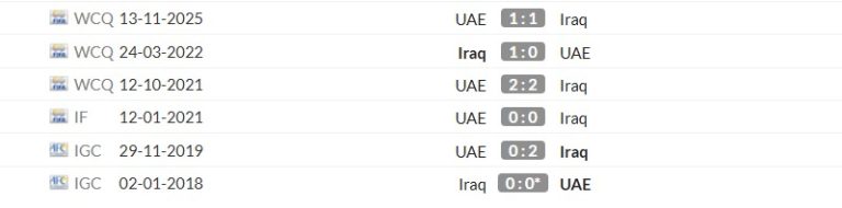 Các trận đối đầu gần đây giữa Iraq vs UAE đều rất căng, chênh lệch không lớn. Trong 6 lần chạm trán gần nhất, Iraq giành 2 chiến thắng, hòa 3 và chỉ thua 1 trận.
