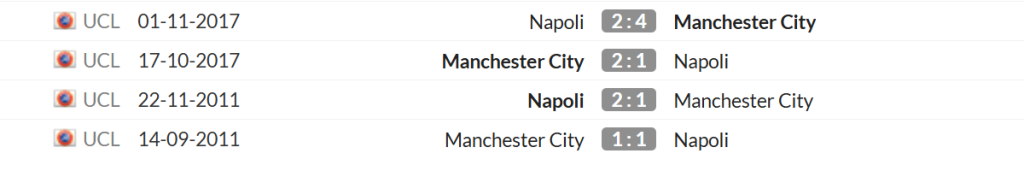 Xét lịch sử đối đầu, Man City thắng 2 trong 4 trận gần nhất gặp Napoli, hòa 1 và thua 1; tổng số bàn hai đội ghi được trong các trận đó là 8 bàn của City và 6 bàn của Napoli – trung bình ~3.5 bàn/trận.
