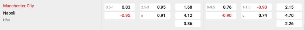 Bảng tỉ lệ kèo Man City vs Napoli: