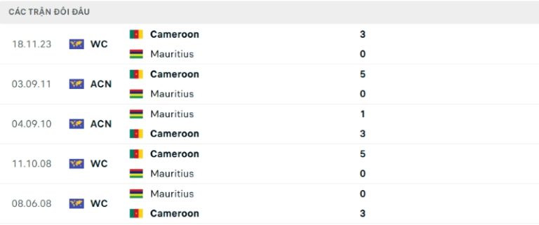 Phong độ các trận đấu gần đây – Mauritius vs Cameroon