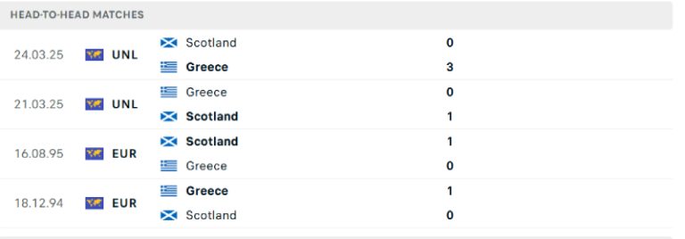 Trong 4 lần gặp nhau gần đây, Hy Lạp nhỉnh hơn với 2 chiến thắng, 1 hòa và 1 thua. Tuy nhiên, phần lớn các trận đấu đó diễn ra trên sân trung lập hoặc tại Hy Lạp. Trên sân nhà, Scotland vẫn duy trì được thành tích tốt hơn khi tiếp đón đối thủ này, đặc biệt là với lối chơi chắc chắn và tinh thần chiến đấu bền bỉ của họ.