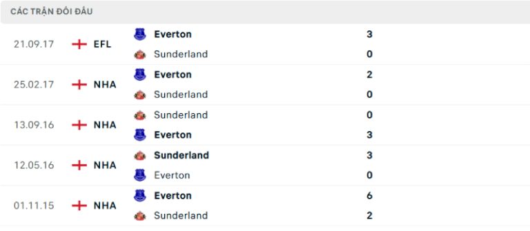 Xét về thành tích đối đầu, Everton hoàn toàn áp đảo Sunderland trong giai đoạn 2010–2017 khi hai đội còn thường xuyên gặp nhau tại Premier League. Trong 10 lần chạm trán gần nhất, Everton thắng tới 7, hòa 2 và chỉ thua 1. Tuy nhiên, bức tranh hiện tại đã khác xa. Sunderland giờ đây là đội bóng trẻ trung, có lối chơi hiện đại và tinh thần chiến đấu cao.