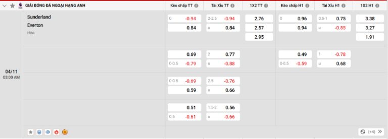 Bảng tỷ lệ kèo Sunderland vs Everton: