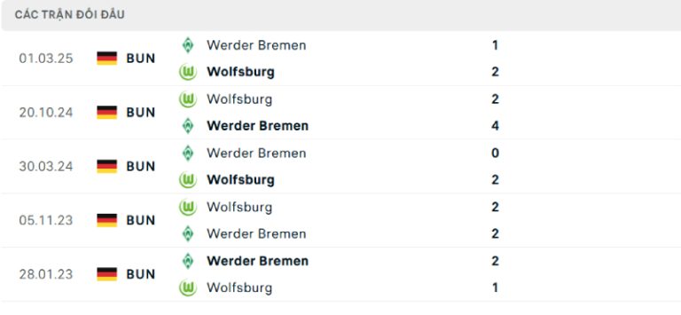 Phong độ các trận đấu gần đây – Werder Bremen vs Wolfsburg