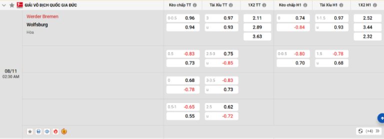 Bảng tỷ lệ kèo Werder Bremen vs Wolfsburg: